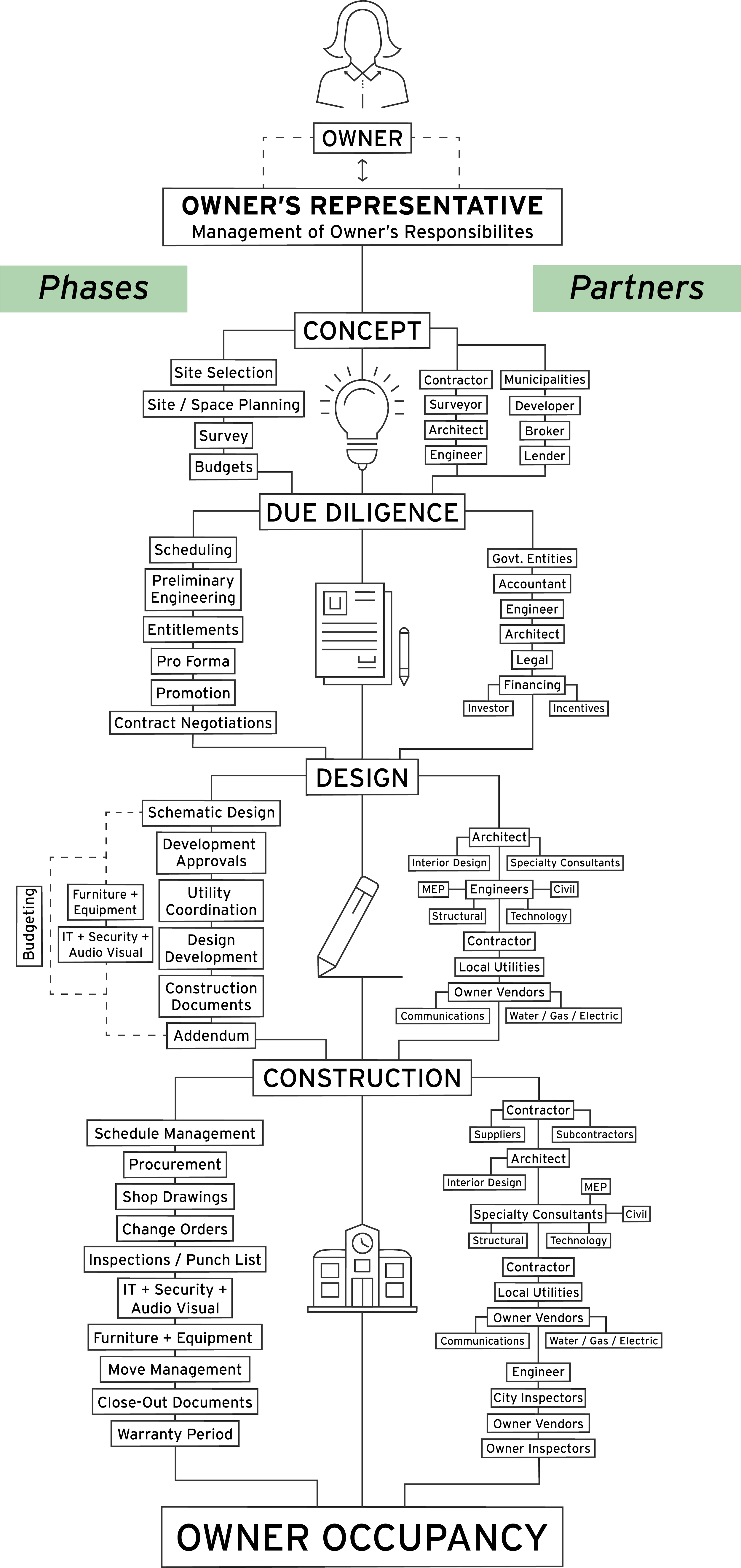 The OR operates entirely in the interest of bringing the owner’s project to life while maintaining relationships, managing the budget and schedule on their behalf. Effective Owner’s Representation happens when the OR remains proactive through the whole process.